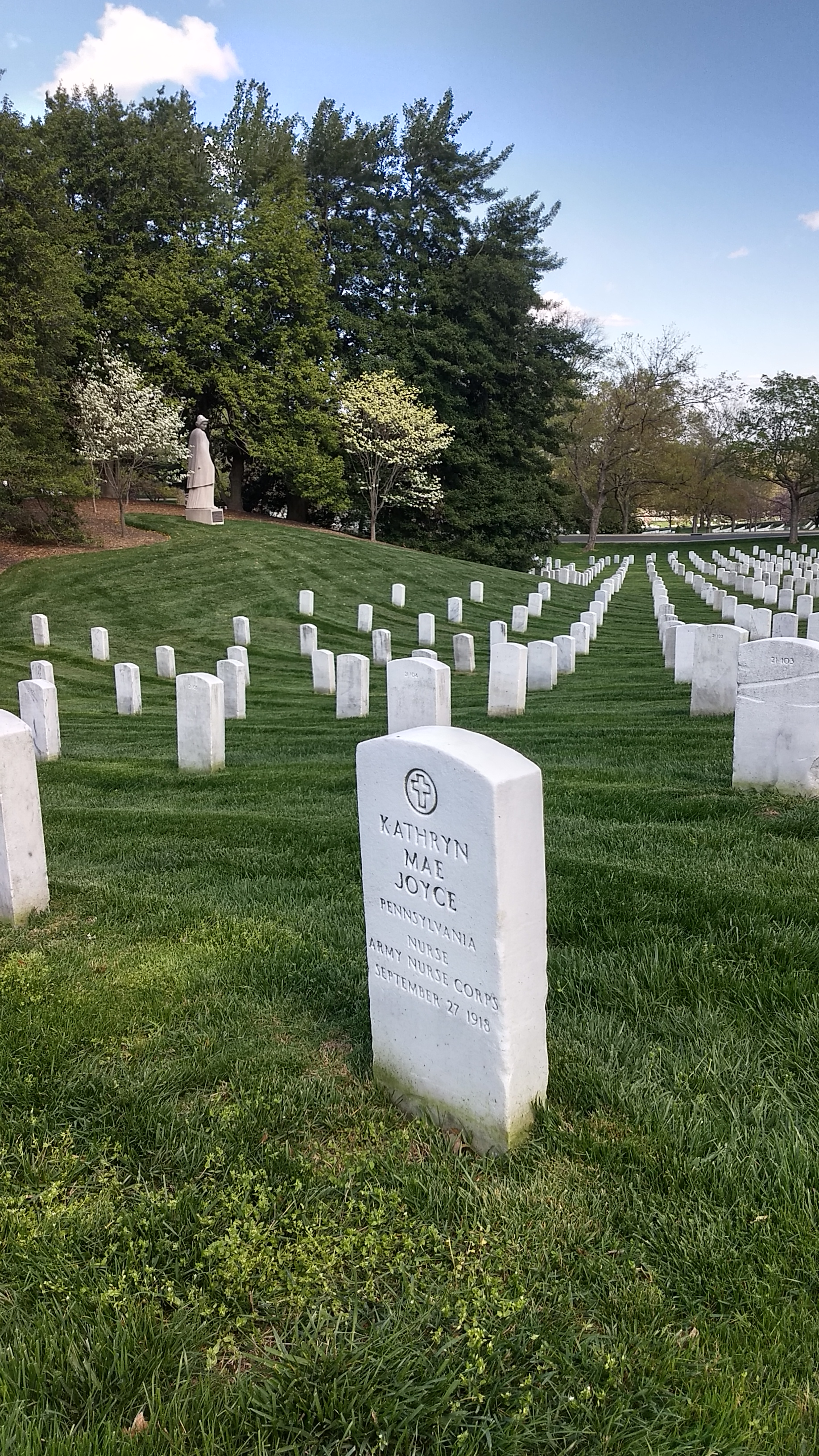 • Kathryn Mae Joyce (Section 21, Grave 47) served as a nurse with the Allegheny General Hospital Red Cross Unit from Pittsburgh, Pennsylvania, designated as Hospital Unit “L” under the supervision of the War Department. A graduate of the Allegheny General Hospital, she sailed with her comrades to England in March 1918 and then traveled on to France. Her unit as operated as part of Camp Hospital No. 21 at Bourbonne-les-Bains, but she later served at an evacuation hospital near Verdun. She died of pneumonia while serving there on September 27, 1918, possibly due to a complication from influenza. She initially received a burial in France near that hospital before her final burial at Arlington National Cemetery. The Katherine Mae Joyce American Legion Post, named in her honor, memorialized her in the years after the war.