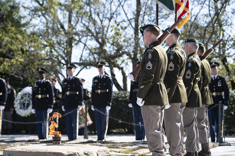 The event commenced with both Old Guard and Special Forces soldiers marching up both sides of the steps to the president’s grave, lining the way to a Color Guard presenting both the American and Special Forces flags. It included a playing of President Kennedy’s Oct. 12, 1961, address at Fort Bragg, a prayer, a moment of silence, the sounding of Taps and an Army band playing “The Ballad of the Green Berets” and “The Army Song.”