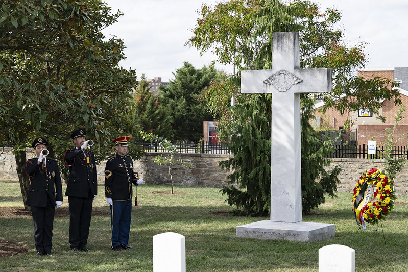 The group then laid wreaths at the Argonne Cross in Section 18, a monument that commemorates the American Expeditionary Forces’ (AEF) last major World War I campaign. There, the two Belgian Army buglers played the “British Last Post,” a traditional final salute to British and Allied service members who fell in the Battle of Ypres, along with “The British Rouse” (also known as “Reveille”). U.S. Army Sgt. 1st Class Kevin Paul contributed by sounding Taps on Gen. John J. Pershing’s personal clarion bugle, which the general obtained in 1918 when he commanded the AEF.