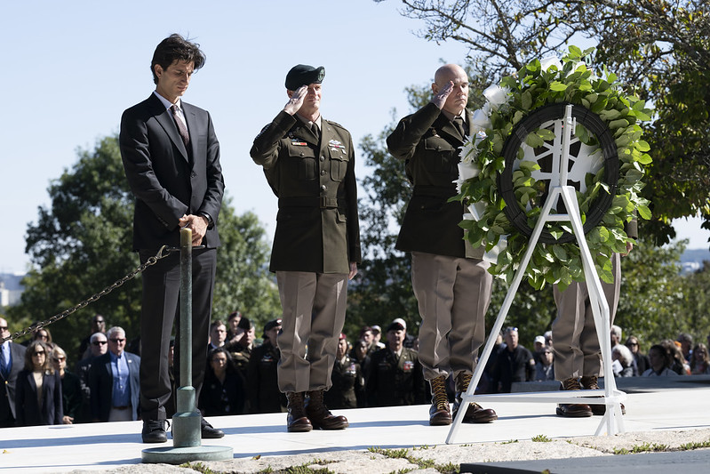 Once the wreath had been laid, Sgt. Maj. Michael Zachary Clayton stepped forward, removed his green beret and solemnly placed it at the president’s grave like Command Sgt. Maj. Ruddy before him. He then stood at attention and saluted, looking down at the grave as a final tribute. The U.S. Army Special Operations Command team, led by Lt. Gen. Jon Braga, also paid their respects by slow-saluting the slain president.