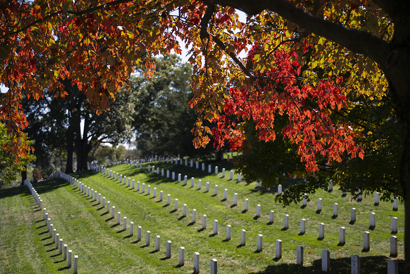 On Nov. 1, 2024, Arlington National Cemetery (ANC) Horticulturist Kelly Wilson led a group of about 20 gardening enthusiasts through the cemetery, with red, orange and yellow leaves crunching underfoot, to explain the cemetery’s trees, plants and flowers on the season’s last Fall Horticulture Walking Tour.