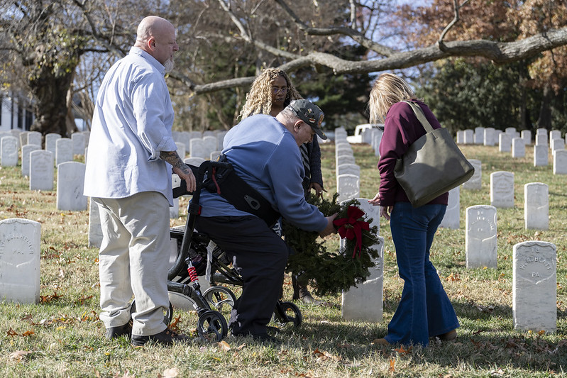 Robert Christman sat in his walker-rollator in Arlington National Cemetery’s Section 27 as his niece handed him a wreath with a bright red bow on top. He started to lay the wreath at the headstone of U.S. Army Pvt. William Christman, his distant cousin, but paused. He then stood up, bent over and laid the wreath. When asked why he stood, he explained, “It’s a thank you and a promise to keep it going.”