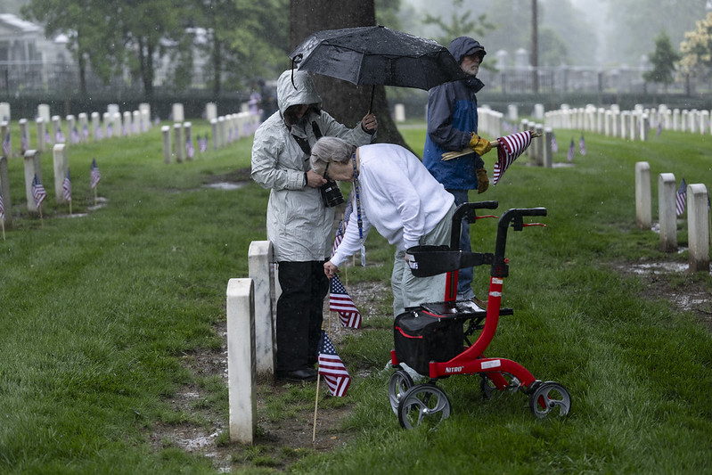Despite gray skies and rain, on the morning of May 22, 2025, U.S. Army soldiers and veterans from the Armed Forces Retirement Home in Washington, D.C., gathered at the adjacent Soldiers’ and Airmen’s Home National Cemetery (SAHNC) to place flags at the headstones of the fallen. In a tradition known as “Flags In,” on the Thursday before Memorial Day, the Army’s 3d Infantry Regiment (the Old Guard) place small American flags in front of every headstone and niche row at both SAHNC and Arlington National Cemetery. During the event at SAHNC, the Armed Forces Retirement Home residents also participate.