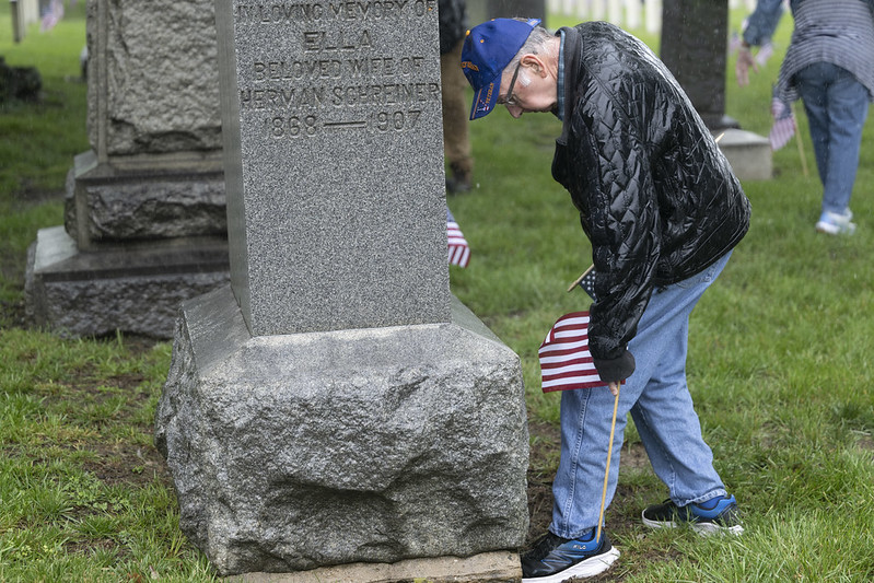 Twenty-year U.S. Navy and Air Force veteran Ernie Stallcop said the rain did not bother him as he placed his flags. “These folks went before us,” he said, “and this is just a way of honoring their commitment and their time serving our nation.”
