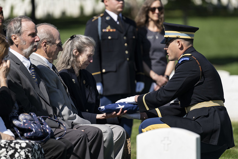 Phyllis wore her mother’s Women’s Army Corps lapel pin to the service. She wiped away tears and held her brother Roger’s hand as they stood for the Army rifle team’s firing of three volleys. When Capt. Joe Ryan presented her with the flag that had been draped over her mother’s casket, she held onto it, then looked up at Ryan as he thanked her for her mother’s service. “It was like he was handing me part of my mother,” she later said. “He looked at me with so much respect on his face.” When the service ended, she walked up to her mother’s casket, dropped to her knees and rested her head on the casket.