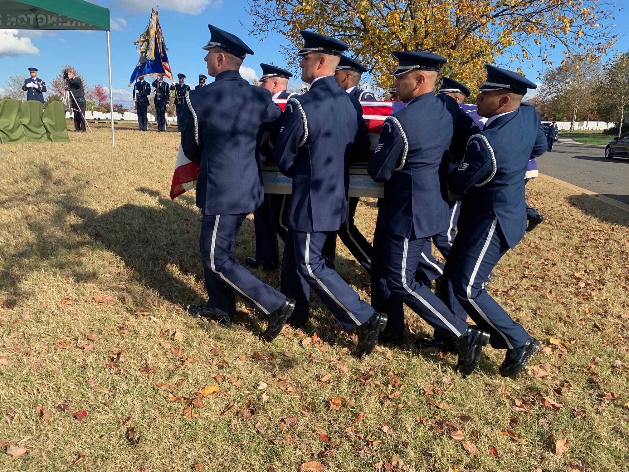 More than 200 members of that Air Force family attended Hall’s funeral service at Arlington National Cemetery on Oct. 30, 2025, many of them wearing yellow duck lapel pins. Attendees flew in from all over the United States, and one group of 15 airmen drove down from Canada. At the service, Father Michael Bryant described Hall as “a very selfless, kind, loving person” who “loved his family and loved those that he served with.”