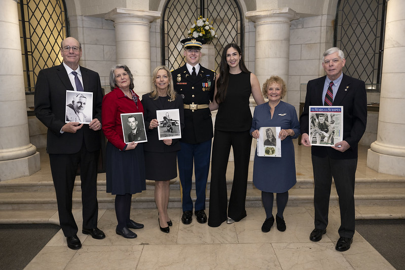 Shine spoke about searching to find her father, U.S. Air Force Lt. Col. Anthony C. Shine, whose aircraft went missing over the Laos-South Vietnam border in 1972; he was identified and buried at Arlington National Cemetery in 1996. Shine then introduced other Gold Star family members (those with family who died or went missing in the line of duty) in the audience. Each stood, held a photograph of a loved one in uniform, stated the name of the person in the photo, and described their actions and what led to their disappearance.