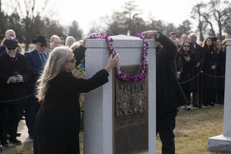 At the Apollo 1 Monument in Section 3, Isaacman laid a wreath and placed flowers at the graves of the two Apollo astronauts buried at ANC, Gus Grissom and Roger Chaffee. These pioneering astronauts, Isaacman explained, enabled the future of spaceflight. “Because of them, safety was strengthened, discipline was sharpened and exploration endured,” he said. “Their spirit and courage live on in the teams and astronauts who carried us to the moon and who will do so again.”