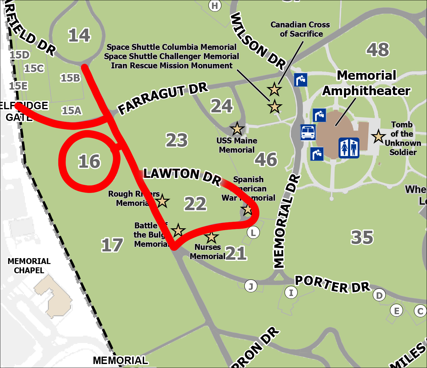From March 10 to May 23, the following roads within the cemetery will close to traffic for storm drain and road repair: