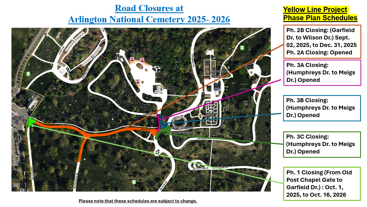 • Portions of the “Yellow Line” road that serves as the cemetery’s main traffic artery (Meigs, Sherman and Schley Drives, between Garfield and Wilson Drives) will be closed to vehicles.