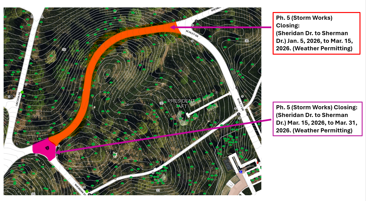 • Depicted in orange on the map, Sherman Drive will be closed to vehicles between Schley Drive and Sheridan Drive.