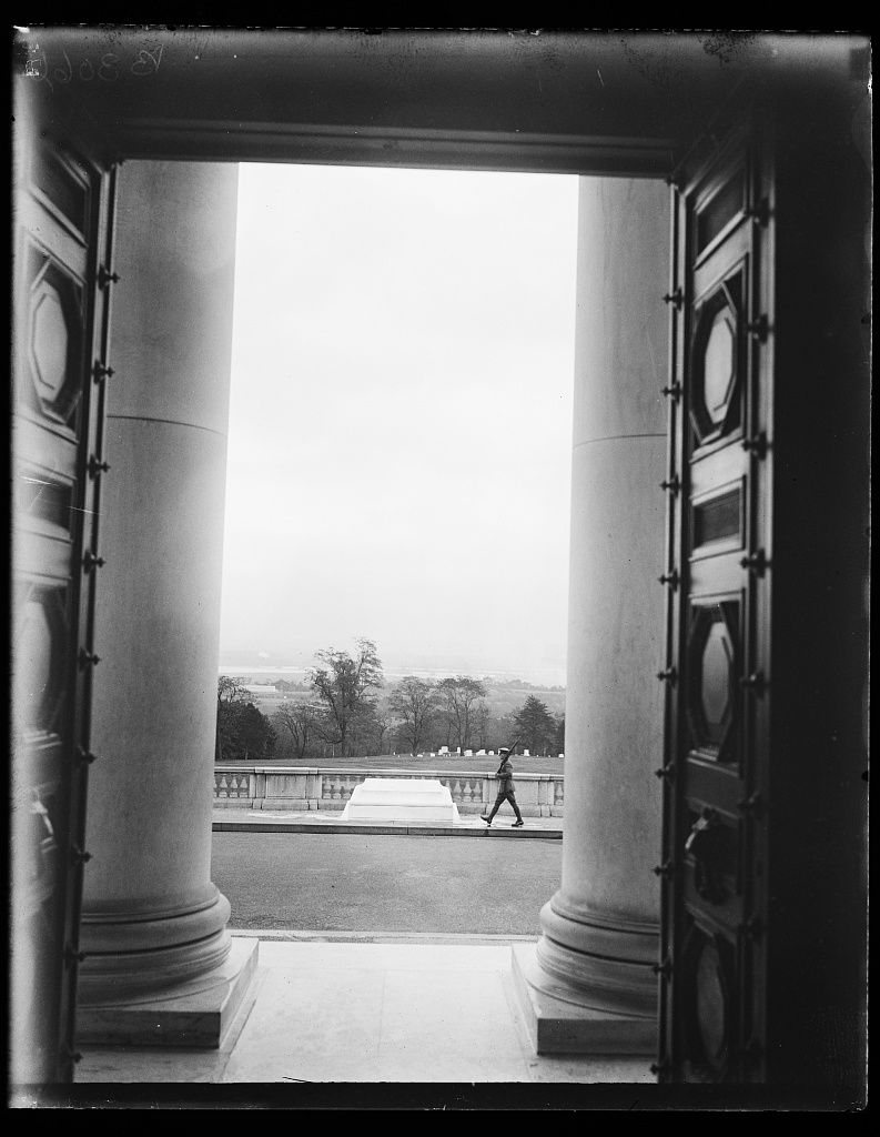 This photo of the Tomb of the Unknown Soldier taken from inside the Memorial Amphitheater Display Room on November 5, 1928, shows a guard protecting the site. (Library of Congress)