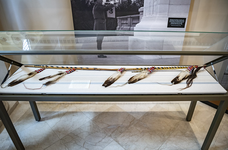 Chief Plenty Coups of the Crow Nation (Apsáalooke) represented American Indians at the funeral of the World War I Unknown Soldier. During the burial service, he removed his coup stick (shown here) and war bonnet. He placed them on the crypt in tribute to the Unknown Soldier and the many American Indians who served and died during the war. (U.S. Army photo)