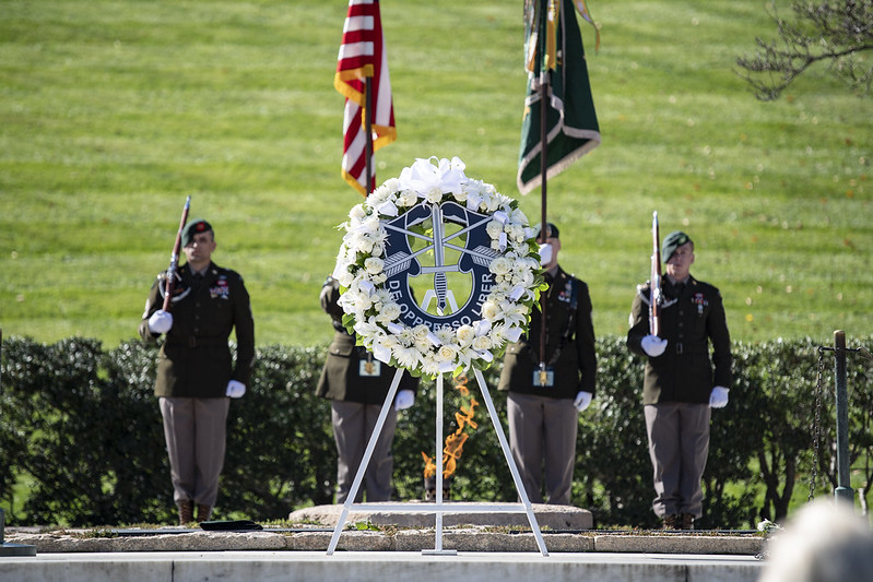 The event commenced with both Old Guard and Special Forces soldiers marching up both sides of the steps to the president’s grave, lining the way to a Color Guard presenting both the American and Special Forces flags. It included a playing of President Kennedy’s Oct. 12, 1961, address at Fort Bragg, a prayer, a moment of silence, the sounding of Taps and an Army band playing “The Ballad of the Green Berets” and “The Army Song.”
