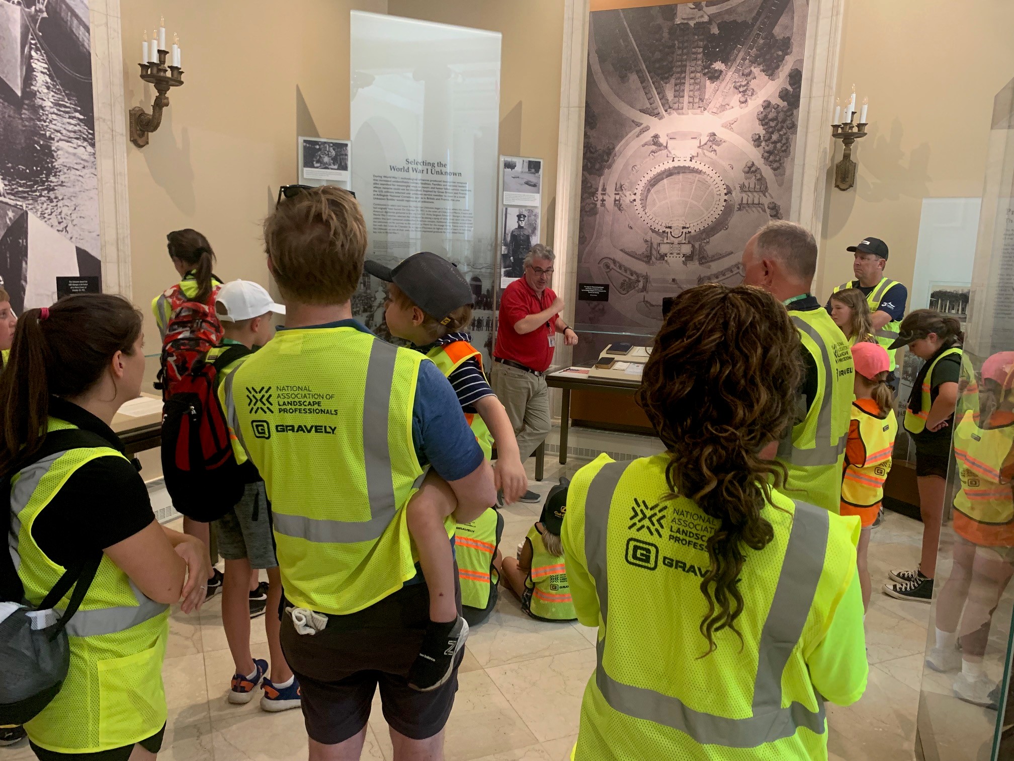 Participants in the NALP Children’s Program, offered to children of landscape professionals, planted flowers near Arlington House and toured the grounds. ANC Command Curator Rod Gainer then hosted a tour of the Memorial Amphitheater Display Room, which features exhibits on the history of the cemetery and the Tomb of the Unknown Soldier.