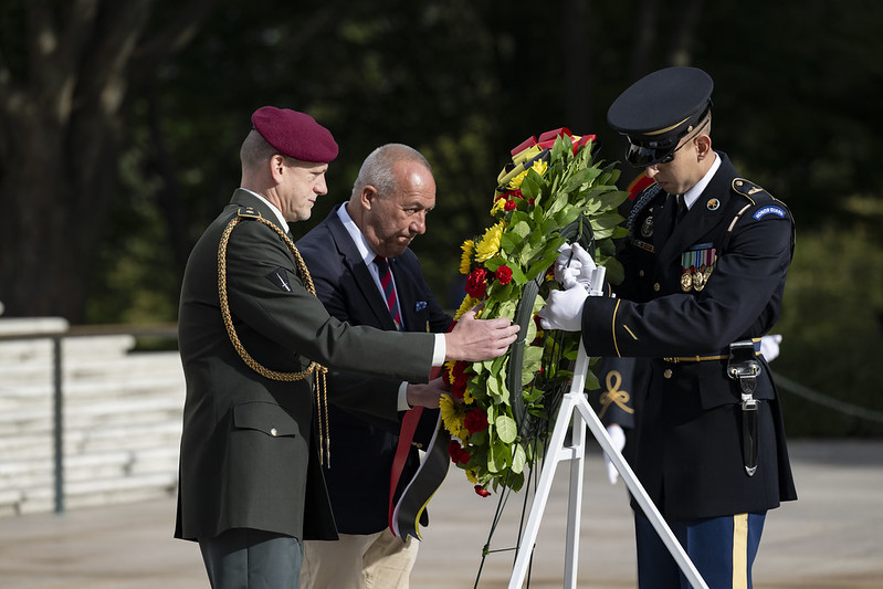 A group of Belgian officials came to Arlington National Cemetery on Sept. 16, 2024, to honor the fallen from World War I. They included Defense Attaché to the Embassy of Belgium Brig. Gen. Bart Verbist; Director of the Ypres Last Post Association Carl Denys; and two Belgian Army buglers, Cpl. Tonny Desodt and Adjutant Christophe Wils. The Doughboy Foundation, which has an exchange program with Belgium, hosted the group—most of whom were in Washington, D.C., for the unveiling of a new sculpture at the World War I Memorial. Doughboy Foundation Director Jari Villanueva gave his guests a tour of the Memorial Amphitheater Display Room, which features exhibits on the history of the Tomb of the Unknown Soldier and its origins during World War I.