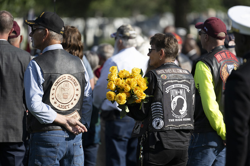 At the service, attendees wore uniforms, suits or leather vests covered in Vietnam War-related patches. They all looked skyward as two Boeing V-22 Osprey aircraft conducted a flyover.