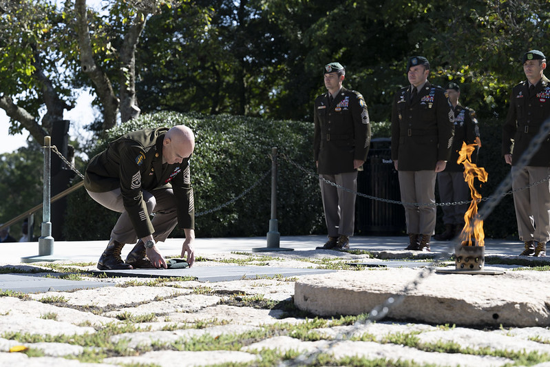 Once the wreath had been laid, Sgt. Maj. Michael Zachary Clayton stepped forward, removed his green beret and solemnly placed it at the president’s grave like Command Sgt. Maj. Ruddy before him. He then stood at attention and saluted, looking down at the grave as a final tribute. The U.S. Army Special Operations Command team, led by Lt. Gen. Jon Braga, also paid their respects by slow-saluting the slain president.