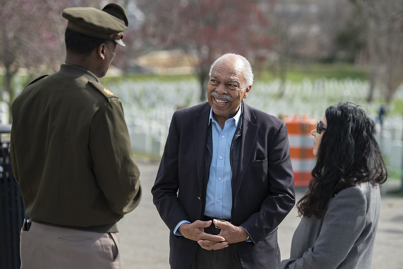 Felder visited ANC in the spring of 2024, to lay flowers at Kennedy’s grave, walk the grounds, and reflect on his role in the president’s state funeral on Nov. 25, 1963, two days after his assassination in Dallas, Texas. Executive Director of the Office of Army Cemeteries and Army National Military Cemeteries Karen Durham-Aguilera and Senior Enlisted Advisor for the Office of Army Cemeteries and Army National Military Cemeteries Sgt. Maj. Donnie Davis (pictured below) greeted Felder and listened to his recollections of the historic state funeral.
