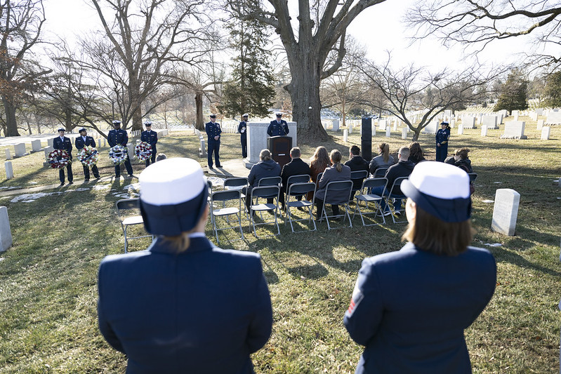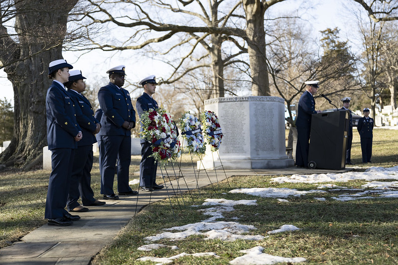 The ceremony included a flyover by a MH-65 Coast Guard helicopter, the singing of the national anthem, the sounding of Taps, a moment of silence, a prayer and the laying of four wreaths around the Serpens Memorial—commemorating the active-duty Coast Guardsmen, Coast Guard reservists, Army soldiers and the physician lost on the ship.