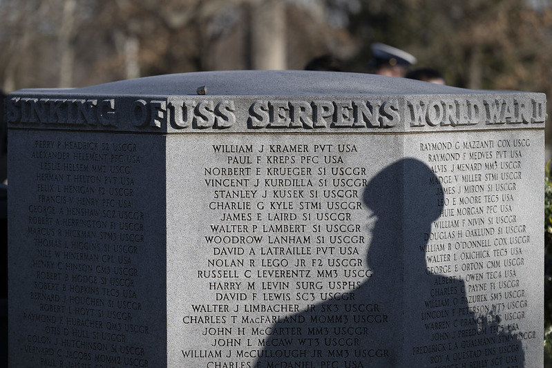 The names on the memorial include Coast Guard Seamen 1st class Lester Brandlen, whose descendants attended the ceremony. Brandlen grew up on the Mississippi River, where he tended boats for wealthy owners. He was also an expert with a rifle, making him an ideal anti-aircraft gunner on the Serpens. “The Coast Guard seemed to fit who he was,” said Erik Brandlen, his grandson, who traveled from Houston, Texas, to honor his grandfather and all those lost on the Serpens. Other Brandlen descendants, some from Arizona, also attended. Erik Brandlen said his grandfather’s sacrifice inspired him and his brother to serve his country. “He retired from the Navy, and I spent time in the Air Force, the Army, the National Guard and the Air National Guard,” he said.