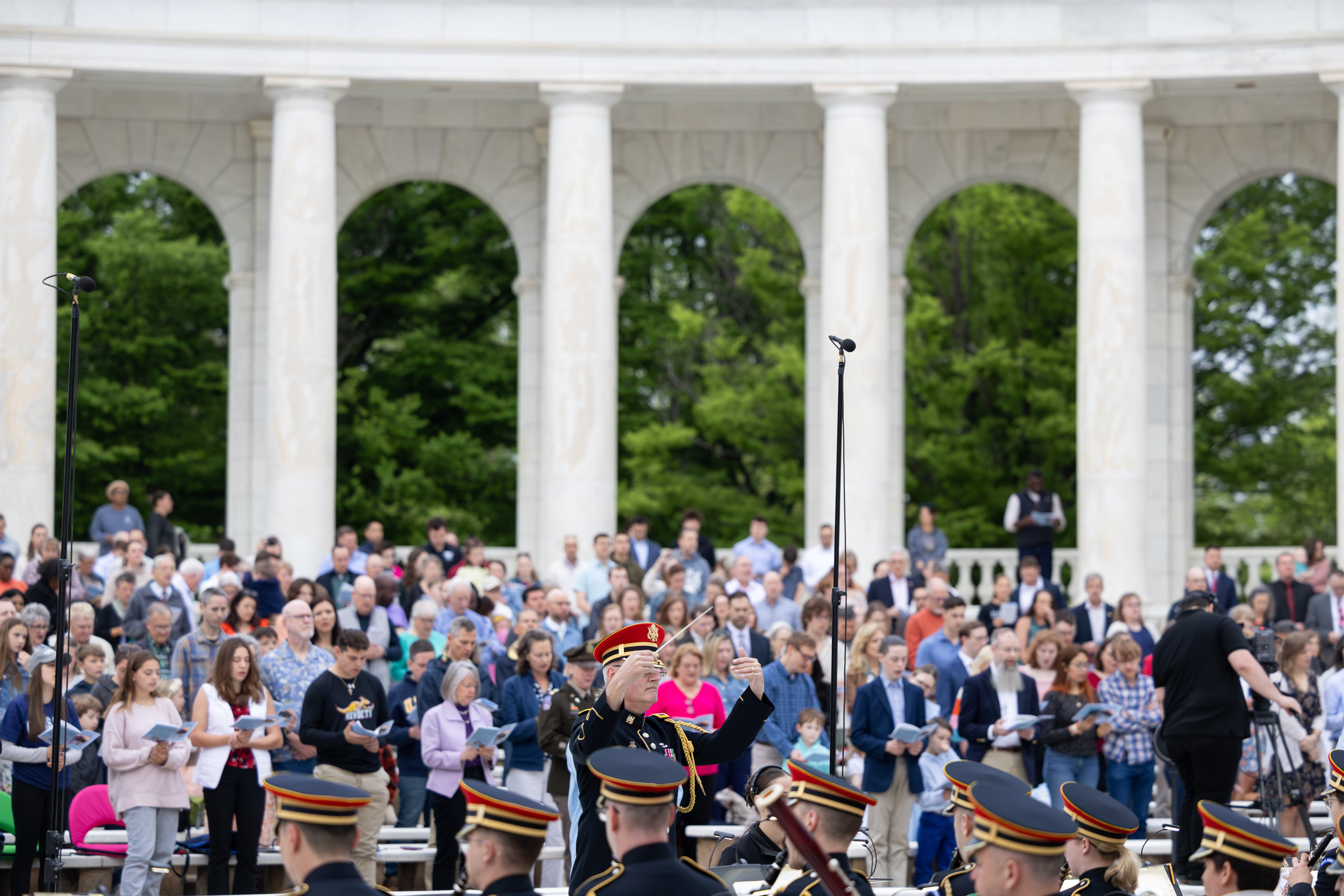 After a musical prelude by the U.S. Army Band, “Pershing’s Own,” Rear Adm. Carey H. Cash, U.S. Navy Deputy Chief of Chaplains, began the service by quoting John McCrae’s famous poem, “In Flanders Fields.” Originally published in 1915, the poem commemorates those who served and sacrificed during World War I and were buried “where poppies grow between the crosses, row on row.” Cash added, “Likewise, we look out at row upon row of headstones that mark the lives of our veterans who gave their lives defending freedom.”