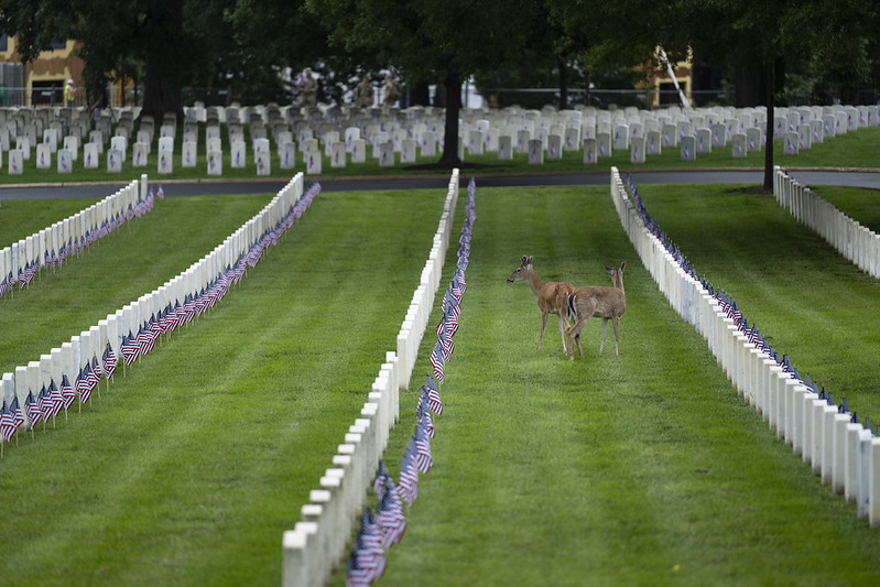 Whenever soldiers came across one of the 21 headstones that marked a Medal of Honor recipient, they paused, put down their rucksack of flags, stood at attention and slowly saluted. They worked quietly to respect the solemnity of the occasion—and to not alarm two deer that had settled in the peaceful cemetery.