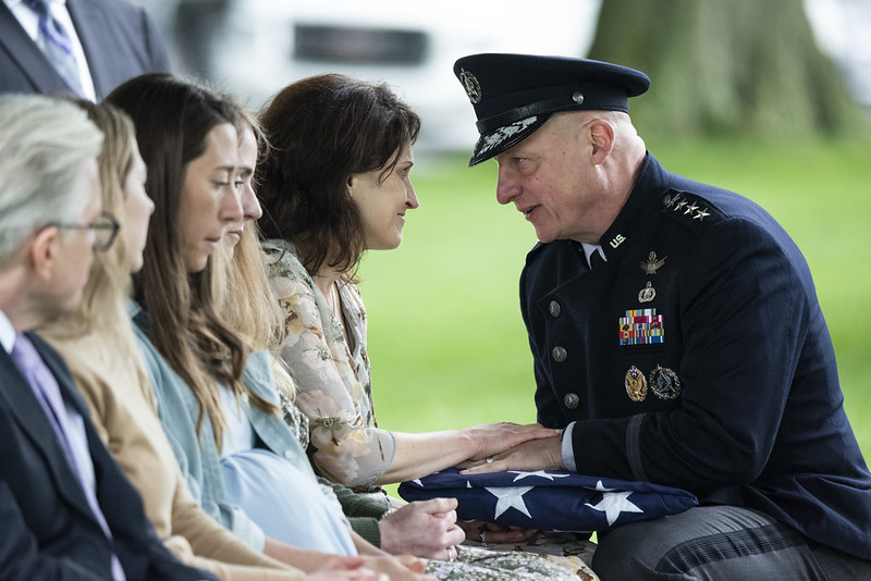 After the Air Force honor guard folded the American flag over Blair’s urn, Space Force Vice Chief of Space Operations Gen. Michael Guetlein presented it to Beth Ann. When Guetlein’s official duties concluded, he gave a hug to Beth Ann and each of her three grieving daughters.