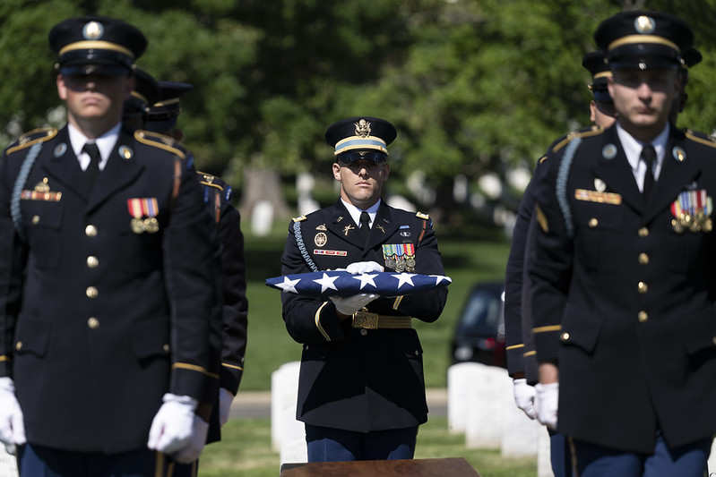 Phyllis wore her mother’s Women’s Army Corps lapel pin to the service. She wiped away tears and held her brother Roger’s hand as they stood for the Army rifle team’s firing of three volleys. When Capt. Joe Ryan presented her with the flag that had been draped over her mother’s casket, she held onto it, then looked up at Ryan as he thanked her for her mother’s service. “It was like he was handing me part of my mother,” she later said. “He looked at me with so much respect on his face.” When the service ended, she walked up to her mother’s casket, dropped to her knees and rested her head on the casket.