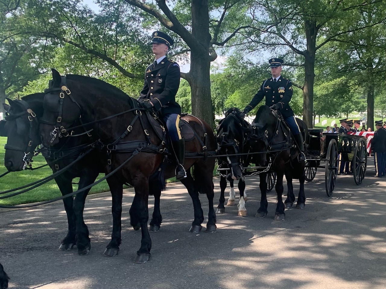 A horse-drawn caisson brought Mahoney’s casket to Section 55, where U.S. Army Chaplain (Capt.) Raymond Akeriwe presided over the service and sprinkled holy water on the casket. Once the honor guard folded the American flag, Sgt. Maj. Sean Sweeney presented it to Mannell. “It was an honor,” Mannell said, “I was very humbled.”