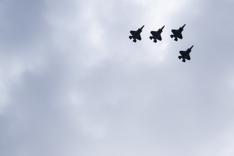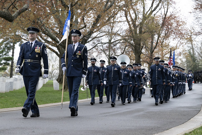 Anderson’s full military funeral honors with escort service commenced with a double flyover: first by four F-35 Lightnings, followed by four World War II-era P-15 Mustangs, two of which bore the name “Old Crow,” the name of Anderson’s fighter. A horse-drawn caisson carried Anderson’s urn to Section 38, where an Air Force firing team fired three volleys, a bugler sounded Taps and a bagpiper concluded the ceremony by playing “Amazing Grace.”