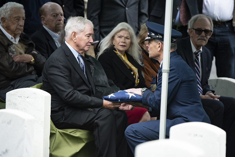 U.S. Air Force Chaplain (Capt.) Andrew Lloyd, who oversaw the service, told the mourners, “In life, Bud Anderson honored the flag with his service to the nation; now, it is our honor to present our nation’s flag in honorable and faithful service.” After the Color Guard crisply folded the American flag over Anderson’s urn, Chief of Staff of the Air Force Gen. Kenneth S. Wilsbach presented it to Anderson’s son Jim, who then passed it to his sister Katherine “Kitty” Burlington, seated next to him. “We’re sharing it,” he later explained.