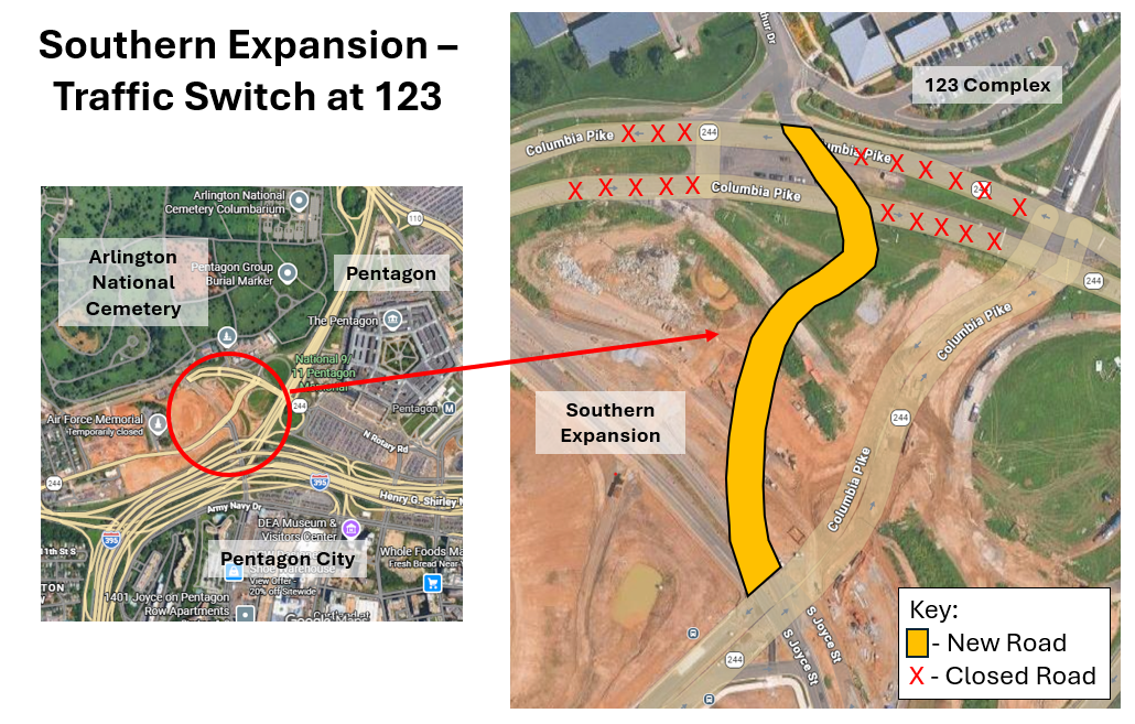 Direct access to the Service Complex Gate via Columbia Pike will be closed. Drivers will be rerouted to a new shared access road connecting to South Joyce Street. These route changes will be in effect until approximately early 2028.