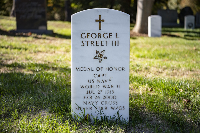 "For conspicuous gallantry and intrepidity at the risk of his life above and beyond the call of duty as commanding officer of the U.S.S. Tirante during the first war patrol of that vessel against enemy Japanese surface forces in the harbor of Quelpart Island, off the coast of Korea, on 14 April 1945. With the crew at surface battle stations, Comdr. (then Lt. Comdr.) Street approached the hostile anchorage from the south within 1,200 yards of the coast to complete a reconnoitering circuit of the island. Leaving the 10-fathom curve far behind he penetrated the mined and shoal-obstructed waters of the restricted harbor despite numerous patrolling vessels and in defiance of 5 shore-based radar stations and menacing aircraft. Prepared to fight it out on the surface if attacked, Comdr. Street went into action, sending 2 torpedoes with deadly accuracy into a large Japanese ammunition ship and exploding the target in a mountainous and blinding glare of white flames. With the Tirante instantly spotted by the enemy as she stood out plainly in the flare of light, he ordered the torpedo data computer set up while retiring and fired his last 2 torpedoes to disintegrate in quick succession the leading frigate and a similar flanking vessel. Clearing the gutted harbor at emergency full speed ahead, he slipped undetected along the shoreline, diving deep as a pursuing patrol dropped a pattern of depth charges at the point of submergence. His illustrious record of combat achievement during the first war patrol of the Tirante characterizes Comdr. Street as a daring and skilled leader and reflects the highest credit upon himself, his valiant command, and the U.S. Naval Service."