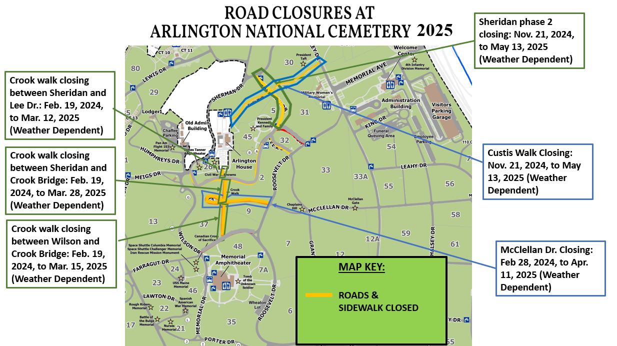 From March 10 to May 23, the following roads within the cemetery will close to traffic for storm drain and road repair: