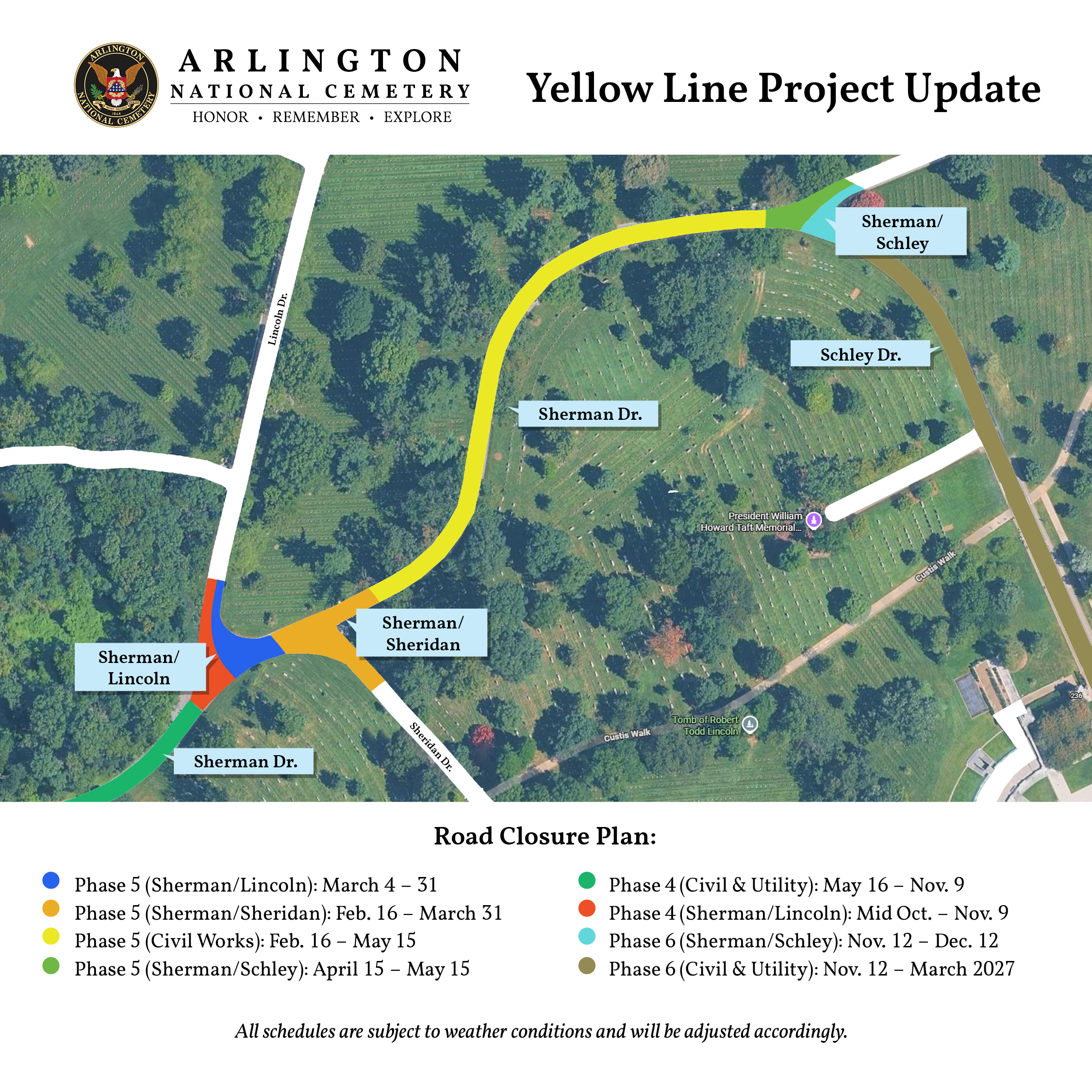 An ongoing, multi-phase road construction project will affect vehicle traffic in Arlington National Cemetery through March 2027. Please refer to the map above for details on the project phases.