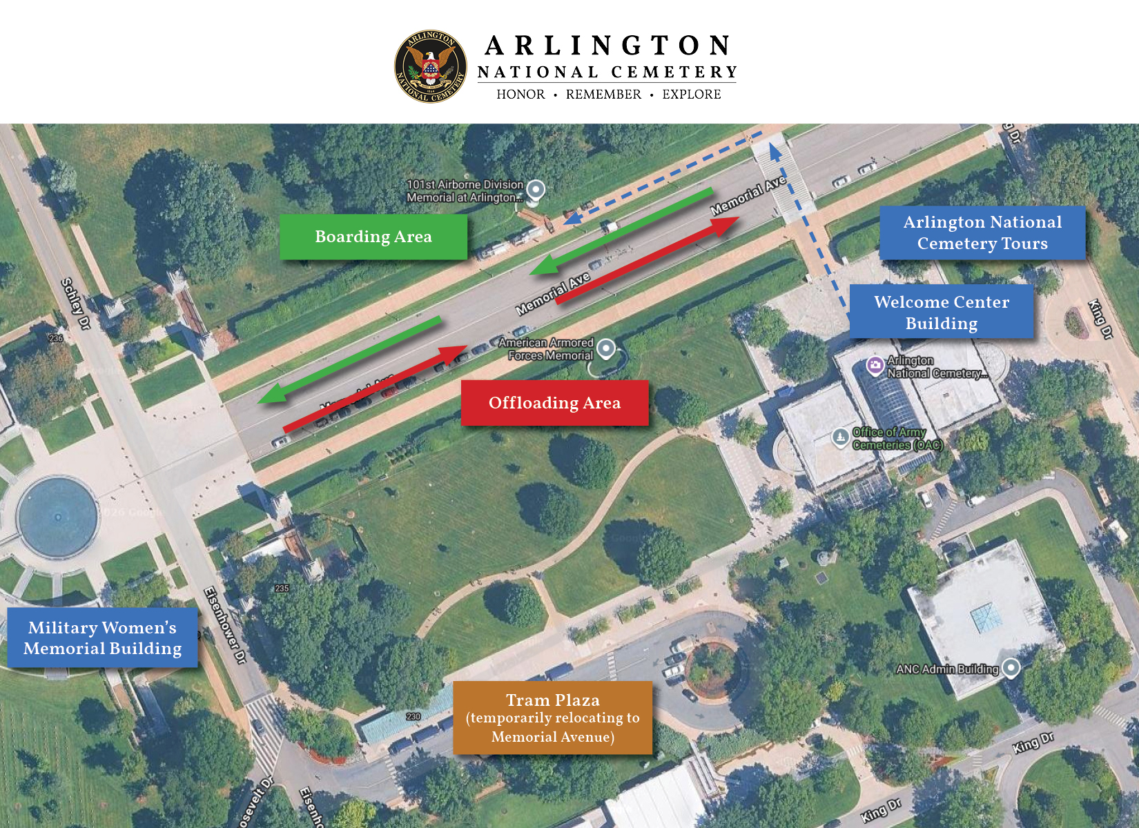 • Offloading: Will temporarily take place on the south side of Memorial Avenue (closest to the Welcome Center)