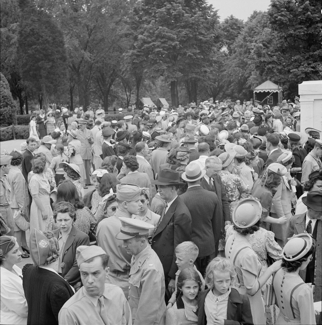 A crowd gathers near the Tomb of the Unknown Soldier after the Memorial Day services in May 1943. Note how close people could walk to the sarcophagus, seen in the photo’s far right edge. Photo by Esther Bubley. (Library of Congress)