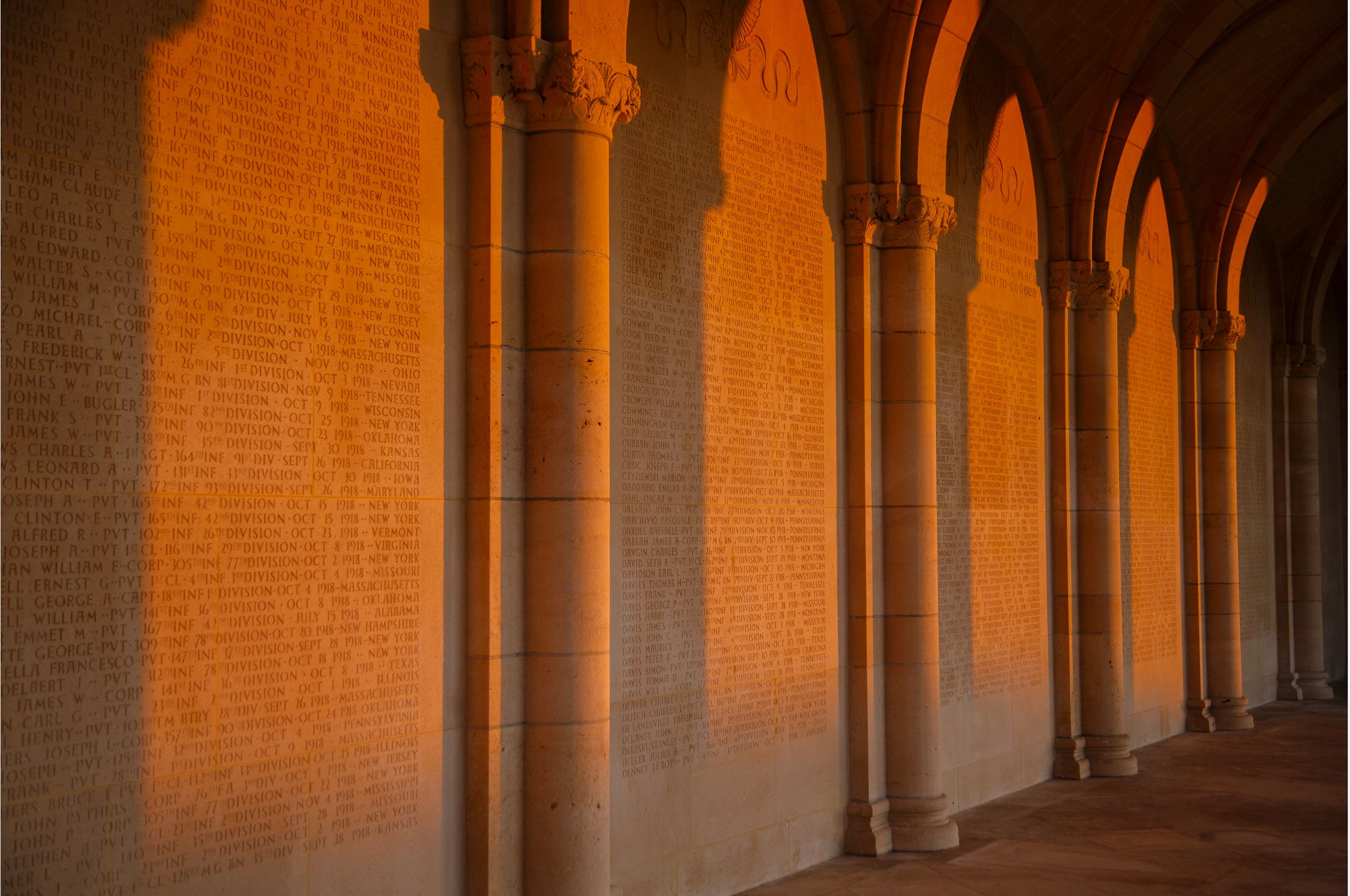 The Walls of the Missing at the Meuse-Argonne American Cemetery in France. (Photo by Warrick Page, courtesy of ABMC)
