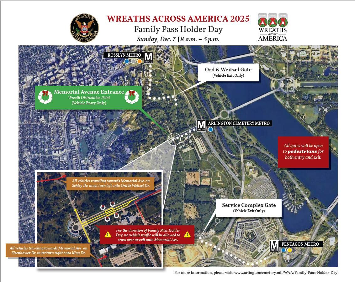 • If traveling by Metro, please use the Arlington Cemetery (Blue line) stop to enter and exit through the cemetery’s main entrance. Family pass holders may also access the cemetery through the Ord & Weitzel Gate, open to pedestrian traffic only, about a 15-minute walk from the Rosslyn stop on the Blue, Orange or Silver lines. However, wreaths will be available for pick up only on Memorial Avenue.