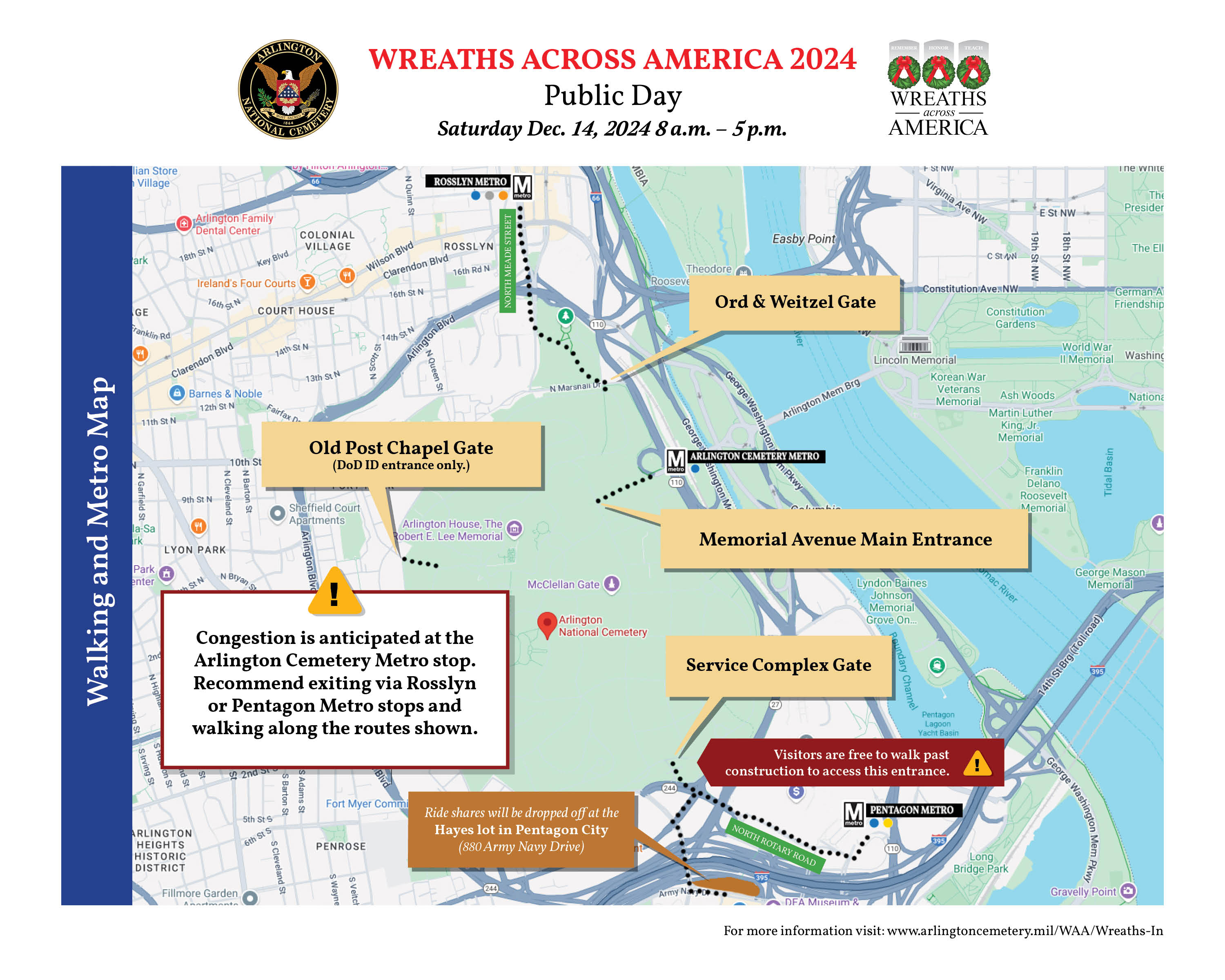 Please note: If the volume of visitors into Arlington National Cemetery exceeds our capacity to conduct a safe event, we will suspend entry into the cemetery. Visitors may wish to consider visiting one of the more than 4,600 participating locations across the country held on National Wreaths Across America Day on Dec. 14 or volunteer to help remove wreaths during our annual “Wreaths Out” event on Saturday, Jan. 11.
